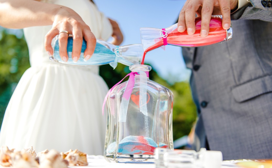 Nécessite deux carafes ou bouteilles contenant du sable de différentes couleurs et un vase.